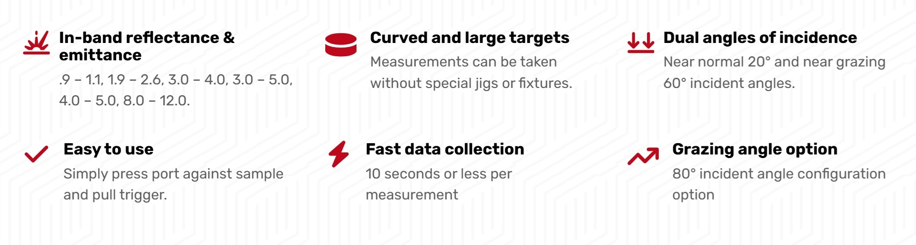 The 410-DHR is a product of collaboration between U.S. Naval Air Systems Command and Surface Optics, with vital input from the Naval Research Lab (NRL) and National Institute of Standards and Technology (NIST). It was developed to answer a broad need for a portable device for the verification of the optical properties of large objects in the field. The 410-DHR measures the integrated surface reflectance of a surface at two angles of incidence (20° and 60°) and for six discreet wavelength bands in the .9 to 12 μm spectral range.