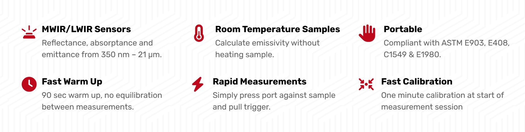 The ET-10 Emissometer answers the long-standing need for measuring emissivity as an entry parameter for calibrating infrared thermography devices. The ET-10 measures total reflectance and directional emissivity at 20 degrees angle of incidence for 3-5 and 8-12 microns. The 8-12 band can optionally be extended to 14 microns. View results immediately on the touchscreen display.