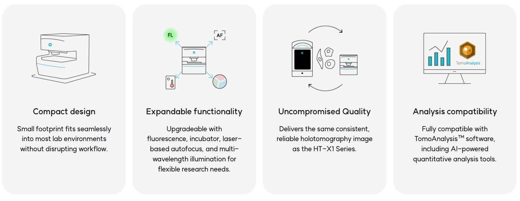The HT-X1™ mini is an accessible system that can be easily introduced into any individual laboratory, from small research groups to multi decipline institutions. It combines a compact footprint with flexible expandability, allowing researchers to start simple and add advanced modules — such as fluorescence imaging, long-term time-lapse with environmental control, laser-based autofocus, and additional wavelengths — as their research evolves. This makes it a future-proof model that grows with the needs of the lab while maintaining ease of use and space efficiency. With this adaptability, researchers can perform label-free 3D live-cell imaging in virtually any setting, including cell culture rooms and shared facilities. By lowering the barriers to adoption and offering scalability without compromise, the HT-X1™ mini empowers scientists to gain deeper insights, accelerate discoveries, and align advanced imaging capabilities precisely with their experimental goals.