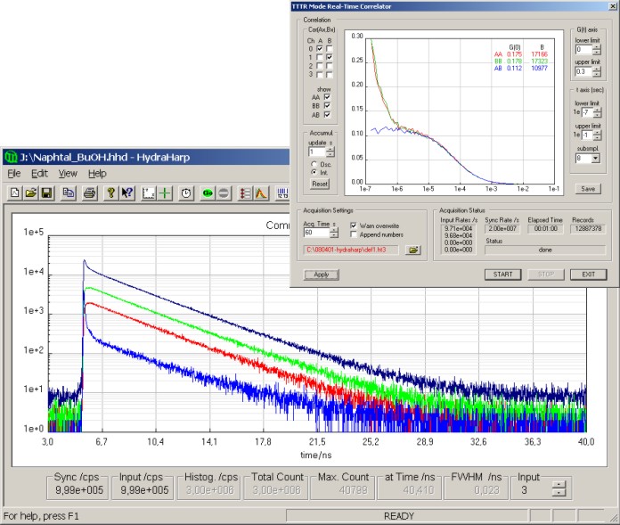 A time-tagged mode for recording of individual photon events with their arrival time on all channels allows the most sophisticated offline analysis of the photon dynamics. Time-Tagged Time-Resolved (TTTR) data can also be correlated in real-time for monitoring of FCS experiments at count rates up to 1,000,000 counts/sec. In TTTR mode, the device can be synchronized with other hardware such as scanners.